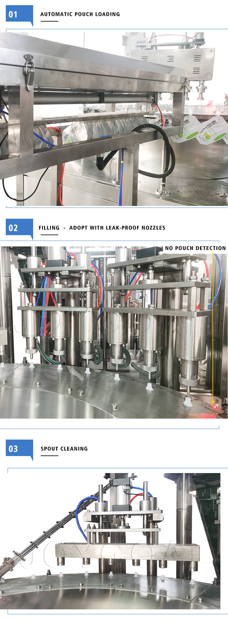 Detections: no pouch no filling, no cap stop, vibrator run automatic