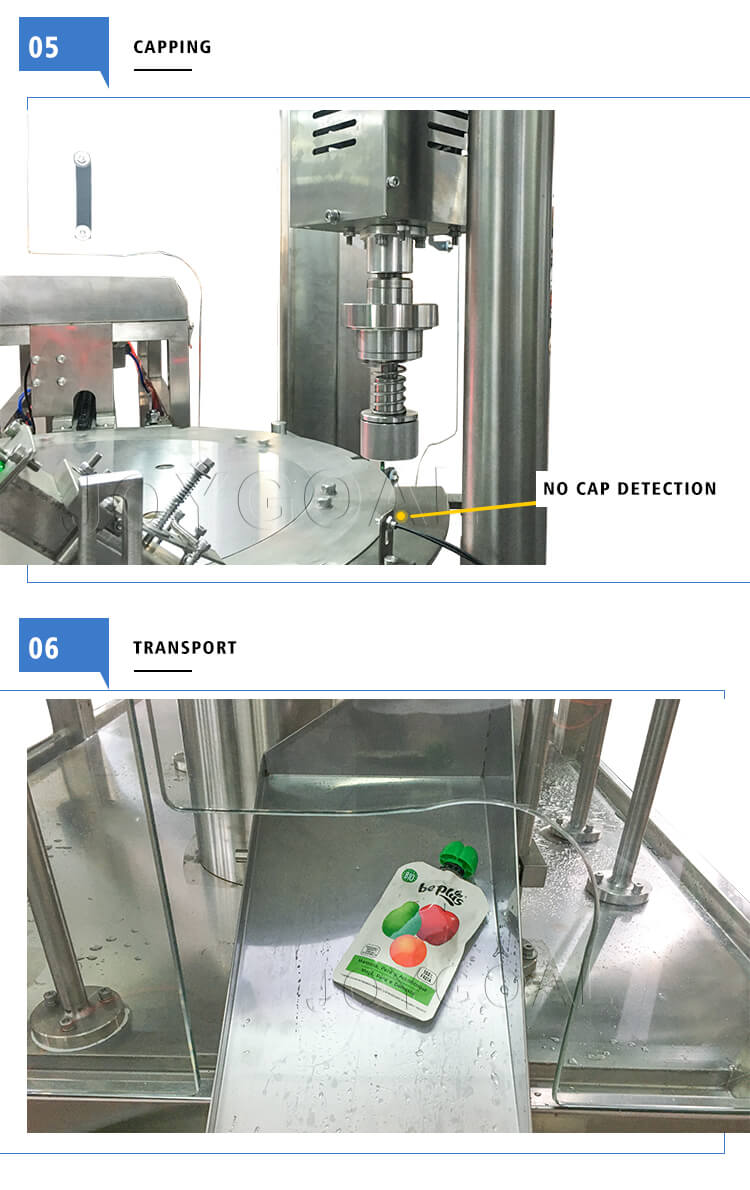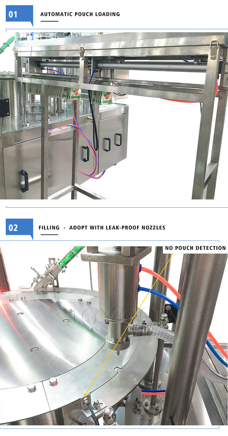 • Food grade 304# stainless steel is used in our spout pouch filling capping machine